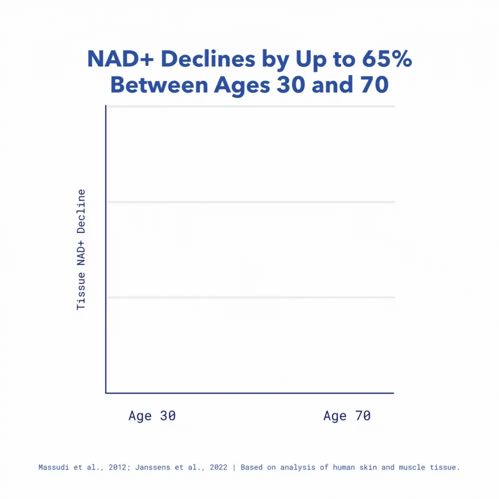 Your 37.2 trillion cells are powered by NAD+, a vital coenzyme that fuels cellular energy and repair throughout your entire body. NAD+ levels naturally decline with age, lifestyle factors, and stressors. Supporting NAD+ levels is essential for supporting your cellular health, energy, and vitality as you age.