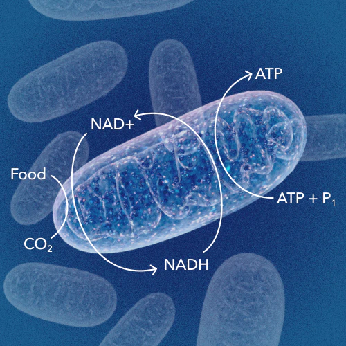 Mitochondrial dysfunction is one of the hallmarks of ageing. The mitochondria are responsible for generating about 90% of the energy your body uses. We like to call them the “energy engines” of your cells. The energy they produce fuels all of our vital functions. They do this by converting the nutrients we get from food into adenosine triphosphate (ATP) via a series of complex processes. The process of energy generation by the mitochondria requires NAD+ in constant supply.